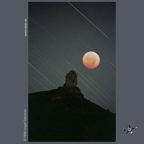 Algunas cámaras permiten realizar dobles exposiciones, una fotografía encima de otra; con ello se pueden conseguir efectos y composiciones intencionadas. En este caso se fotografió primero el eclipse de luna con un objetivo 420 mm.(210 + duplicador) y posteriormente se realizó una circumpolar con el Roque Nublo con objetivo 210 mm. Hay que tener en cuenta el encuadre de las diversas exposiciones. Características Técnicas: