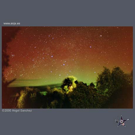 Pon el puntero sobre la imagen para que aparezca la leyenda de la fotografía "CRUZ DEL SUR Y AURORA" Esta fotografía es la primera de la serie "Aurora Austral" donde claramente se puede identificar la aurora. Cuando estaba realizándola no era consciente de que se empezaba a producir una aurora, la luz roja no la apreciaba, y la luz verdosa amarillenta la confundía con posible contaminación lumínica de alguna población. Al tiempo pensaba que algo no "cuadraba" pues minutos antes esa contaminación no existía, y ademas a pocos metros en esa dirección solo se encontraba el océano antártico (me encontraba en Catlins, la zona mas al sur de Nueva Zelanda, Latitud 46º 30min Sur). No duró mucho el desconcierto, pues en la siguiente foto ya sí aprecié la aurora con su estructura cambiante. Sobre la palmera iluminada se distingue la constelación de la Cruz del Sur y encima la zona oscura de la Vía Láctea llamada "El Saco de Carbón". En la parte superior derecha destacan las estrellas alfa y beta de la constelación Centauro. En la diagonal se aprecia el tramo de la Vía Láctea entre Centauro y Carina, sólo observable desde latitudes sur.