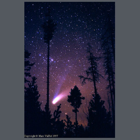 Esta fotografía la entiendo como una de estas recompensas. Fue hecha en el Pallars Sobirà, a unos tres quilómetros del refugio Pla de la Font (Pirineo leridano), a unos 1900 m de altitud, la noche del cinco de abril de 1997 hacia las 23 horas, horario local. El principio de la sesión no pudo ser más desastroso! La noche era seca pero ventosa. A pesar de esto, clavando el trípode con las patas bien cortas en la nieve y al abrigo de los árboles la estabilidad era bastante buena. Claro que luego los problemas los tenía a la hora de encuadrar ya que prácticamente tenía que estirarme encima la nieve para poder ver a través del visor si el cometa y los árboles aparecían tal como yo quería. Pero bueno, hasta aquí pasa. El problema realmente serio vino cuando, justo antes de la primera (!) exposición, se me rompió el cable disparador. Aquella noche la Luna era casi nueva y el cometa se encontraba en la zona noroeste del firmamento. Eso quería decir que al cabo de unos pocos días, con la Luna creciente en el horizonte oeste la observación del cometa no sería tan espectacular y, por lo tanto, era preciso aprovechar la noche que tenía por delante y las siguientes. Así que decidí tirar para adelante y hacer las fotos apretando manualmente el botón disparador. A mi favor jugaba el hecho que las exposiciones serían de treinta segundos o más, con lo cual las pequeñas vibraciones que introduciría se extinguirían en los primeros segundos y durante el resto la cámara estaría estabilizada. El tercer problema significativo de aquella noche, y sin duda el más fatídico, fue la gradual aparición de una neblina que subía por la ladera del valle noroeste. Sólo pude hacer once fotografías aquella noche. Tras la onceava me pareció inútil malgastar tiempo, calor y película con aquel cielo. En el bloque de anotaciones escribí: "Final sesión: el cable roto. La cola iónica no se ve. Malas condiciones para el H-B (horizonte NW). El resto de estrellas, bien. Viento!" volví al todo-terreno (que tuve que dejarlo un quilómetro más abajo por la nieve y hielo del camino), comí cuatro galletas de chocolate y volví a Espot a dormir. Unos días después, al revelar la película quedé pasmado de ver lo bien que habían quedado aquellas once fotografías, sobretodo porque pensaba que habrían quedado bastante mal. En particular, la última es la que está expuesta aquí. Evidentemente ahora me arrepiento de no haber disparado unas cuantas más aquella noche! (Marc Vallbé) " Características Técnicas: