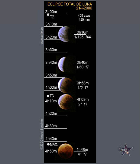 Al fotografiar un eclipse de Luna nos encontramos con distintas situaciones: La Luna llena, la Luna en penumbra y la Luna en umbra, así como situaciones intermedias de llena-penumbra y penumbra-umbra. Para cada situación existen tablas fotográficas. La dificultad estriba en las situaciones intermedias, donde las grandes diferencias de luminosidad impiden la correcta exposición de todo el conjunto por lo que hay que optar por exponer correctamente la zona iluminada ó la zona oscura (o una exposición intermedia), con los consiguientes efectos de sobreexposición y subexposición, lo normal es optar por la zona predominante. Para mas seguridad se suele efectuar una serie con diversas exposiciones. Esta imagen es producto de una composición digital de 5 series de fotografías del eclipse ordenadas en el tiempo. Se ha elegido la mejor de cada serie. En cada una se muestra la exposición realizada. El punto T2 corresponde al segundo contacto, T3 al tercero y MAX a la centralidad del eclipse. Características Técnicas: